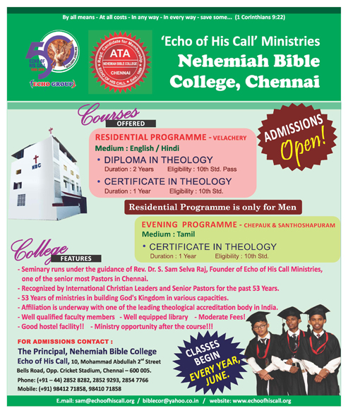 ECHO OF HIS CALL MINISTRIES is a registered Christian organization founded by REV. S. SAM SELVA RAJ that seeks to disseminate the Love of Jesus Christ and to cause transformation in the lives of people all around the world. Since its inception in 1969, Echo of His Call Ministries earnestly seeks to serve people irrespective of caste, creed, colour, gender, ethnicity and nations. By the grace of God, the Lord had enabled us to be powerful instruments of change and hope. The ministry was able to effect profound change in countless lives from sin, sickness, superstitious beliefs, oppression and backwardness of social, cultural and spiritual natures. Echo of His Call Ministries serves the Lord and the Body of Christ for more than four decades and envisage doing great things for the Lord in the days to come.